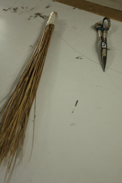 | A plastic container used to hold glue and a broom stick being used to apply the glue |